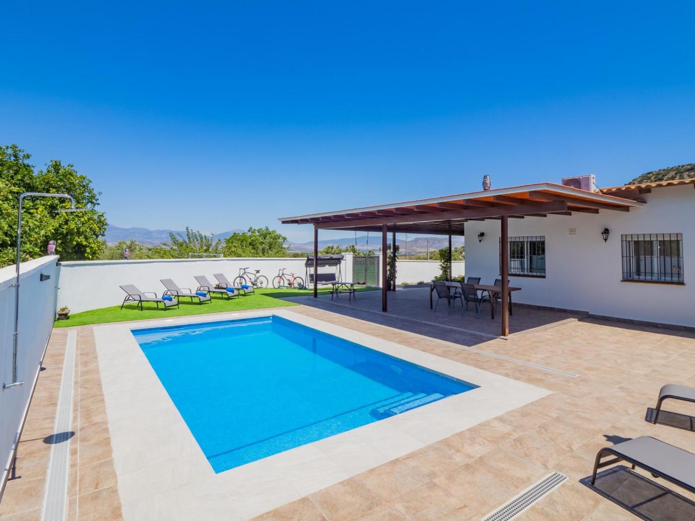 The spacious holiday home has 3 bedrooms, 3 bathrooms, bed linen, towels, a TV, a fully equipped kitchen, and a terrace with mountain views. The property offers pool views.