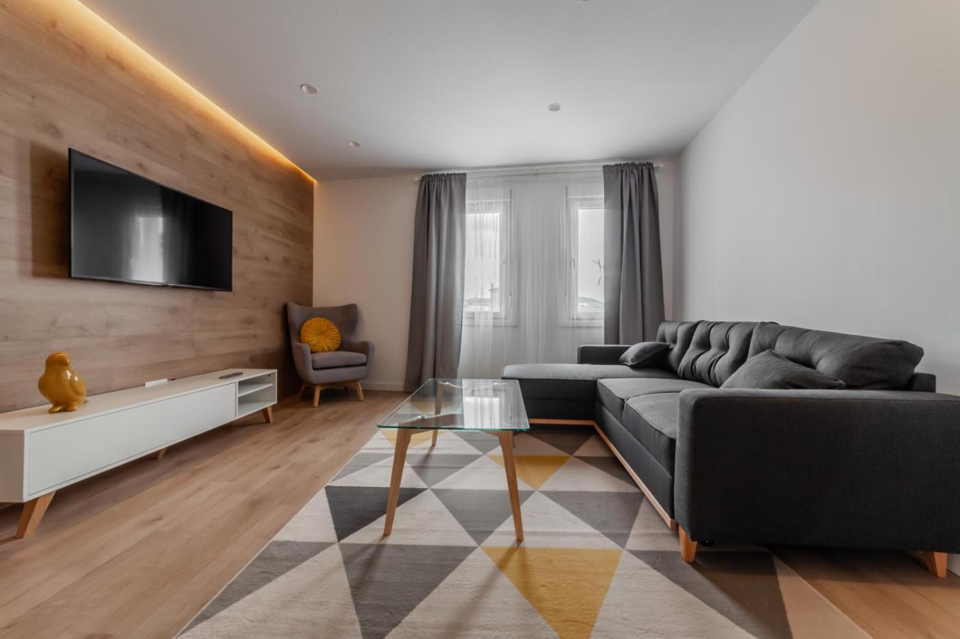 One-Bedroom Apartment. This apartment includes 1 living room, 1 separate bedroom and 1 bathroom with a walk-in shower and free toiletries. Meals can be prepared in the well-fitted kitchen, which has a stovetop, a refrigerator, kitchenware and an oven. This apartment is air-conditioned and has a seating area with a flat-screen TV, a washing machine, soundproof walls, a tea and coffee maker, as well as a dining area. The unit has 2 beds.