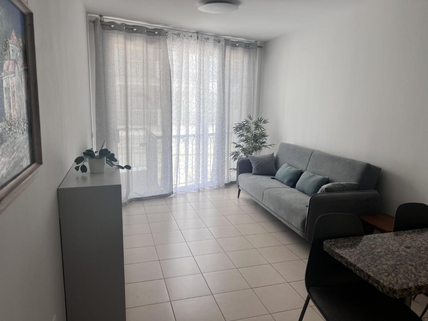 The apartment with a balcony and pool views features 1 bedroom, a living room, a flat-screen TV, an equipped kitchen with an oven and a microwave, and 1 bathroom with a shower. Towels and bed linen are provided in the apartment.