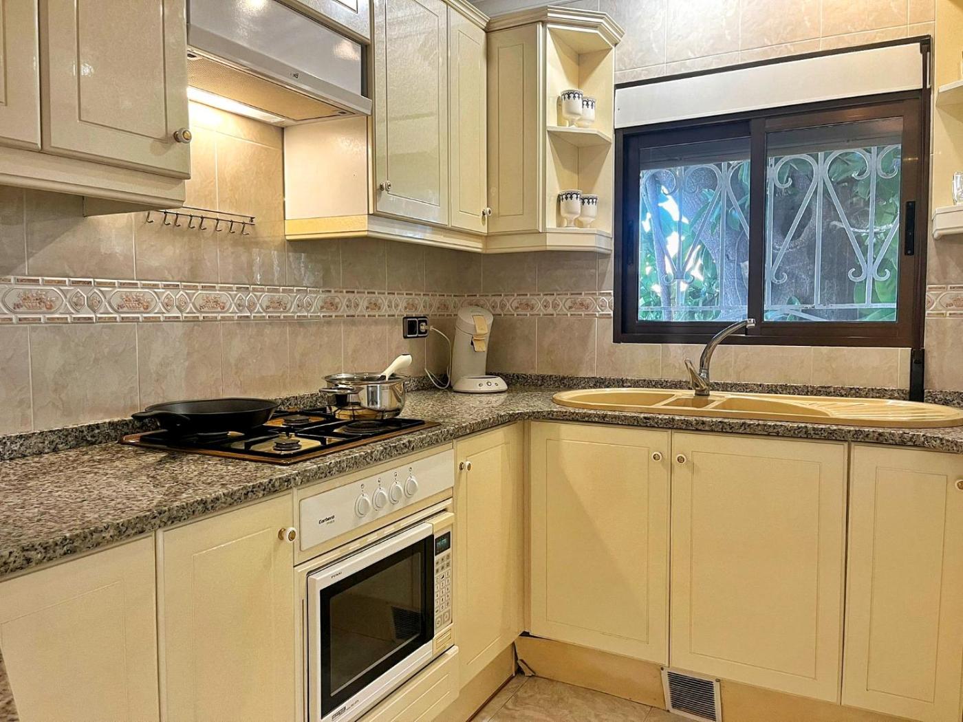 Three-Bedroom House. Boasting a private entrance, this air-conditioned holiday home includes 3 bedrooms, 2 bathrooms and a kitchen. In the kitchen, guests will find kitchenware, a microwave and a toaster. The spacious holiday home offers a TV with satellite channels, a washing machine, a coffee machine, a barbecue as well as garden views. The unit has 4 beds.